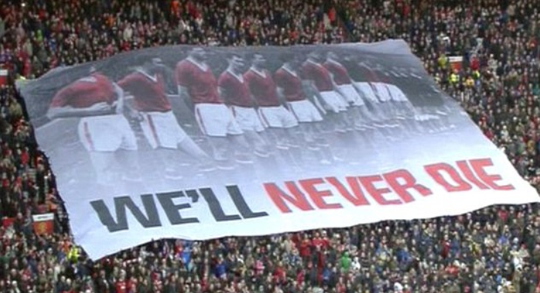 Here’s a big story about a thumping loss off the pitch. In February 1958 a young football team full of talent and potential were favourites to win the European Cup after having easily won the English top league by eight points having only been just knocked out of the previous year’s European Cup by eventual winners Real Madrid. The team were then in Belgrade battling and coming out on top against a strong Red Star Belgrade team, drawing 3-3 in the quarter final second leg, but winning on aggregate. Returning to England they flew via Munich to refuel. On take off, the plane crashed. It killed 23 of the 40 passengers. Three of the dead were club staff, the president, a trainer and a coach. Eight were players nearly all under 25: Billy Whelan (aged 22), Duncan Edwards (21), Eddie Coleman (21), Tommy Tailor (26), David Pegg (22), Mark Jones (24), Roger Byrne (28) and Geoff Bent (25). Last weekend saw the 68th anniversary of the disaster; the day Manchester United, the best team in the English league, was scythed in two. Half dead, half alive. On Saturday, the disaster was remembered and a huge banner unfurled over hundreds of heads. It read ‘We’ll Never Die’.